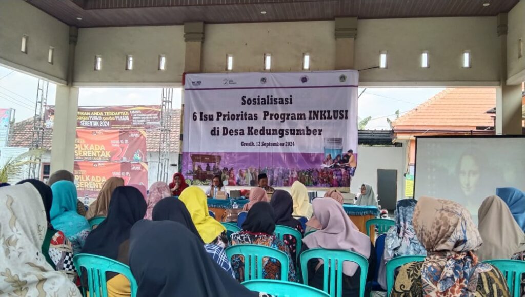 Bertempat di balai Desa Kedungsumber, dilaksanakan ‘sosialisasi 6 isu prioritas program INKLUSI’. Menghadirkan narasumber Ir Soerati Mardiyaningsih Msi, Sekretaris Pemberdayaan Perempuan dan Perlindungan Anak dan Kependudukan (DP3AK) Kabupaten Gresik, dengan peserta para perempuan yang ada di Desa Kedungsumber, Kamis (12/9/2024).