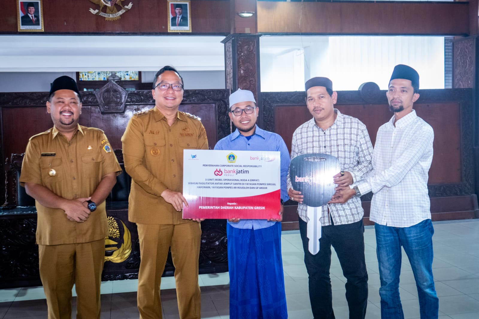 Tiga unit mobil tersebut lantas diserahkan kepada Pondok Pesantren (Ponpes) Sirojul Haromain dan Ar-Roudloh, serta GP Ansor Bawean. Dengan agenda serah terima ditandai penandatanganan berita acara oleh Wakil Direktur Utama Bank Jatim Arief Wicaksono, bersama Bupati Gresik Fandi Akhmad Yani di dampingi Wakil Bupati (Wabup) Gresik Asluchul Alif, bertempat di Pendopo Kabupaten Gresik, Selasa (3/3/2026).