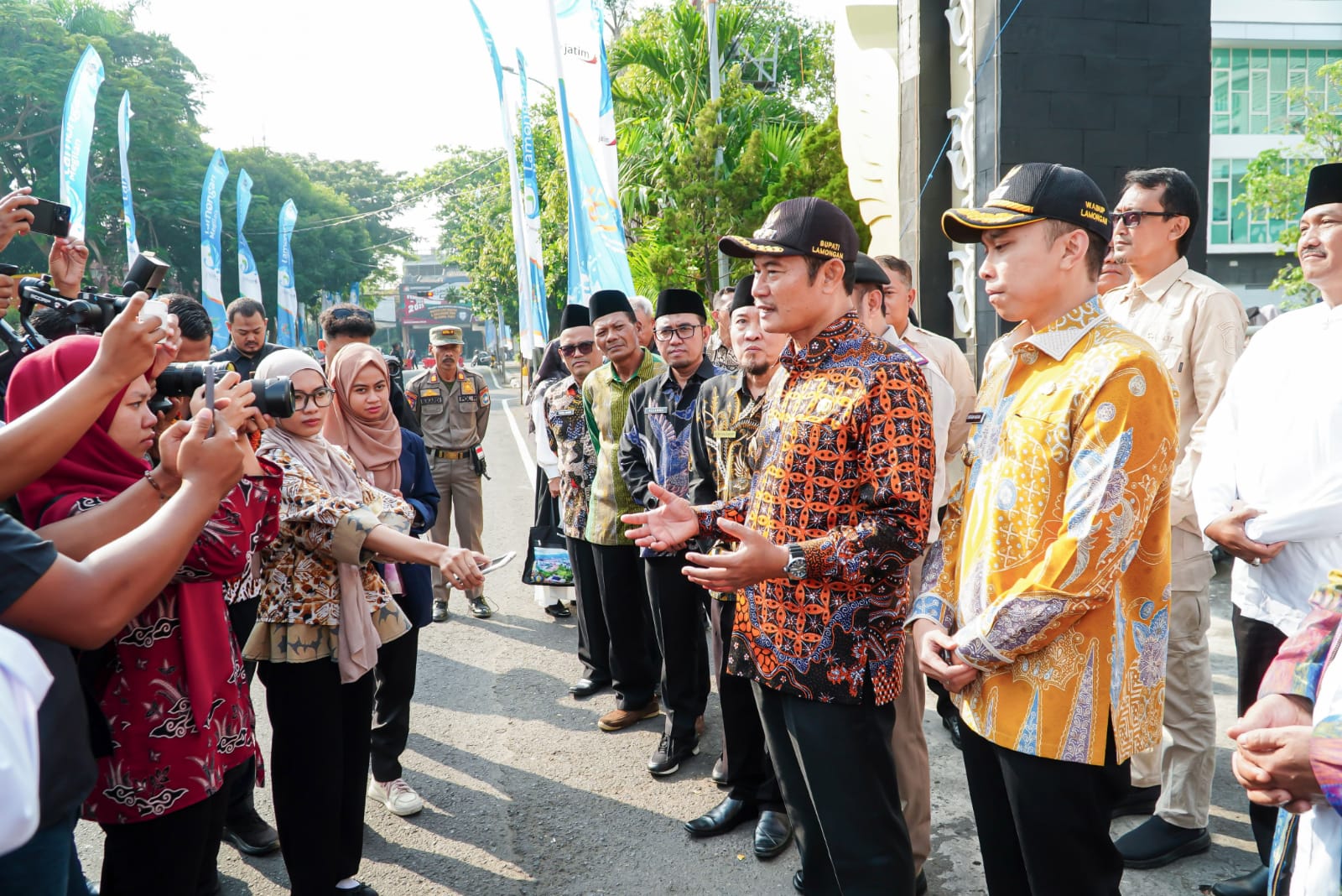 “Hari ini kita memberangkatkan Laskar Gema Tawaf. Laskar ini adalah beberapa relawan pasukan dari perguruan tinggi, Kantor Pertanahan, Kantor Kemenag, yang semuanya berkolaborasi agar Gema Tawaf ini bisa sukses,” tutur Pak Yes-sapaan akrab Bupati Lamongan Yuhronur Efendi.