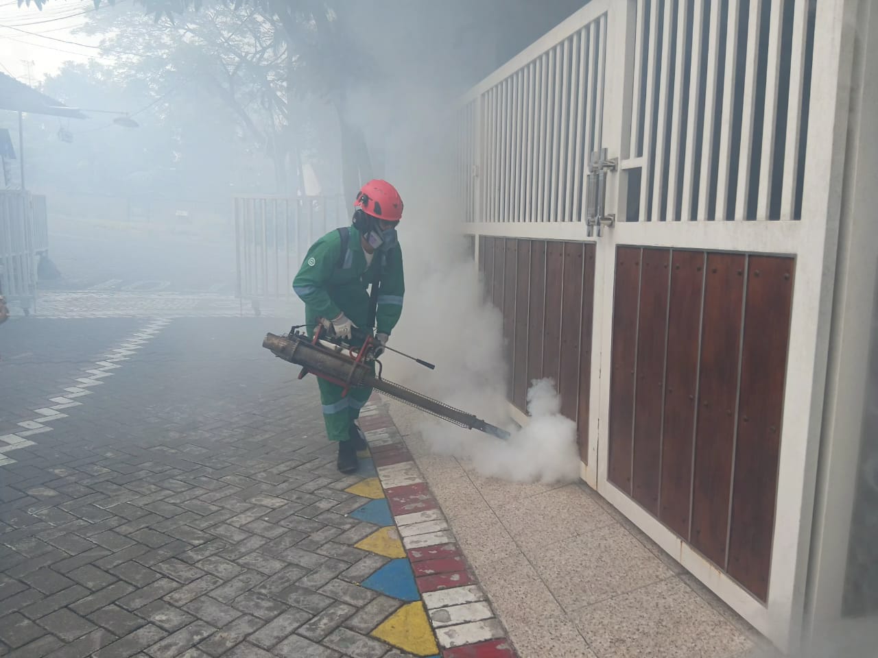Sebab curah hujan yang masih cukup tergolong tinggi, berpotensi tumbuhnya jentik nyamuk aedes aegypti. Sehingga sejumlah aparatur desa mengawal petugas fogging di wilayah Dusun Karangtanjung, tepatnya di Perumahan Green Hill RW 04. Mereka berkeliling,sembari membuat seruan supaya warga membuang atau mengosongkan genangan air di bak maupun kaleng bekas, karena tempat tersebut favorit nyamuk aedes aegypti.