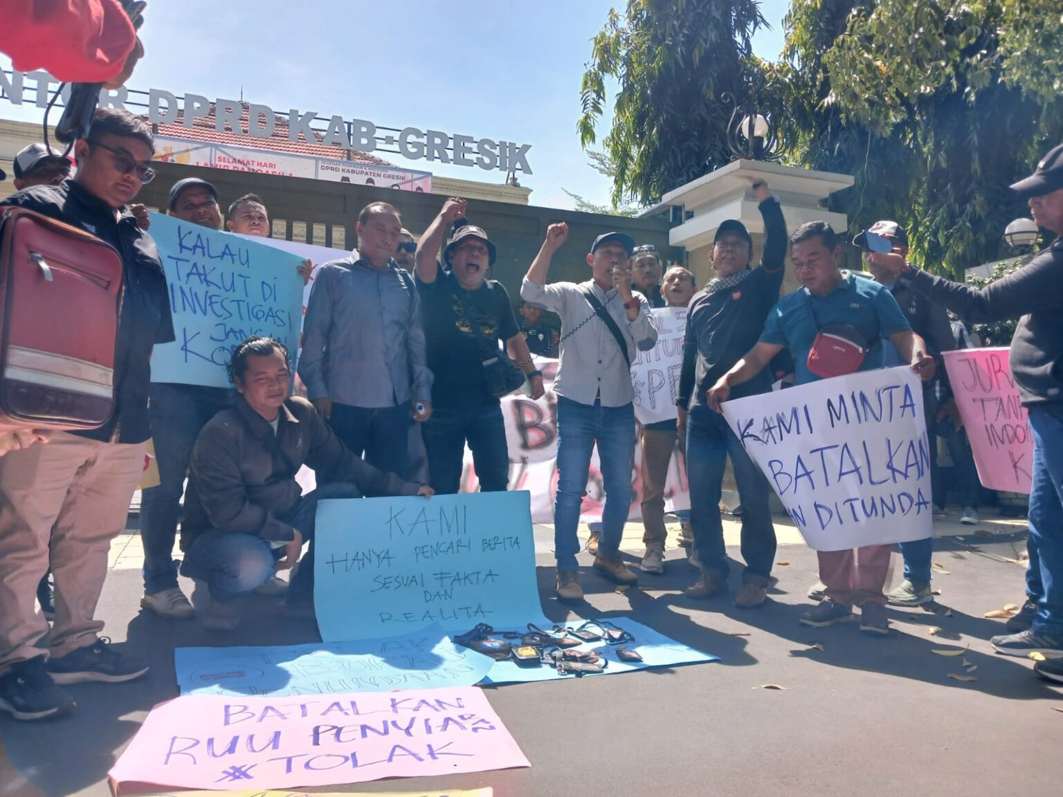 Sebagai wujud nyata, para wartawan melakukan unjuk rasa di depan gedung DPRD dan kantor Pemerintah Kabupaten (Pemkab) Gresik, dengan membawa spanduk dan poster berisikan penolakan disertai juga dengan aksi teatrikal, Senin (3/6/2024).