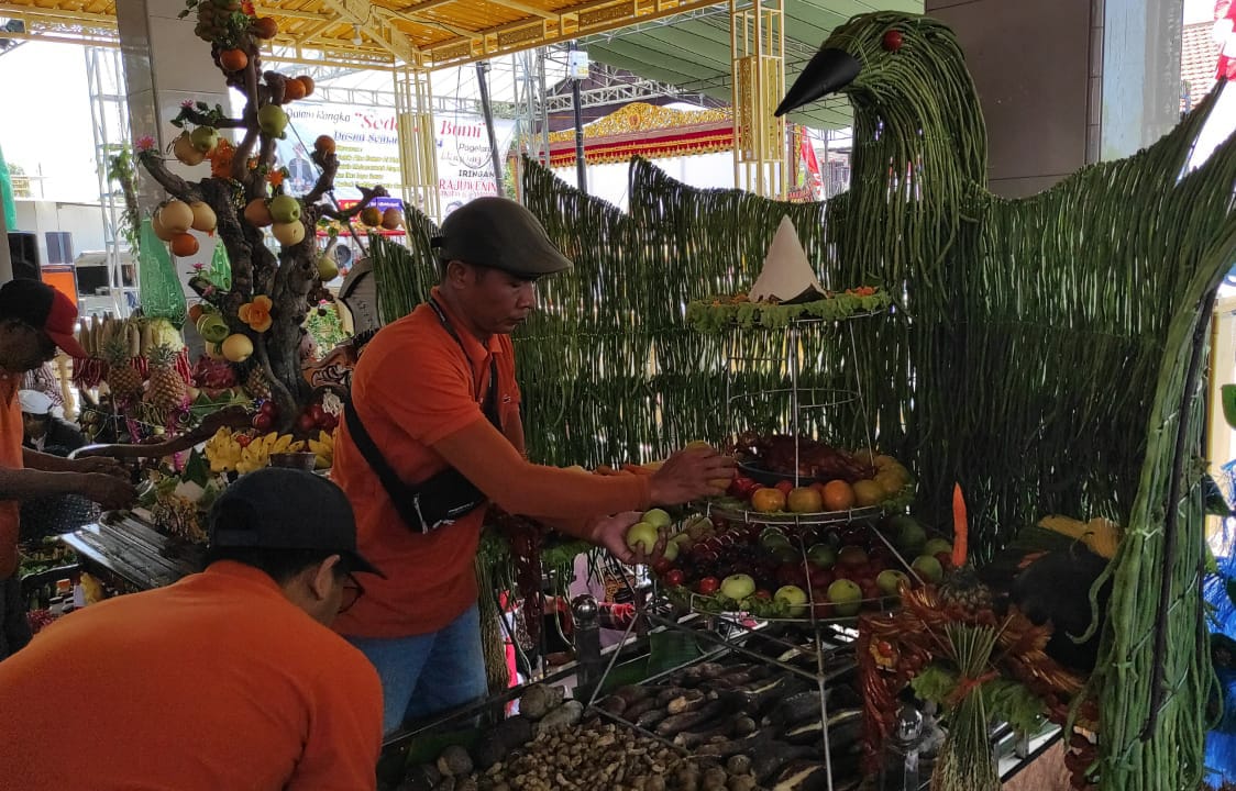 “Semuanya dikelilingi hasil panen pertanian. Ada buah apel, semangka, kacang, ketela, tomat, ikan bandeng, nanas, belimbing, jeruk, pisang dan jajan pasar,” kata Achmad Syahid.