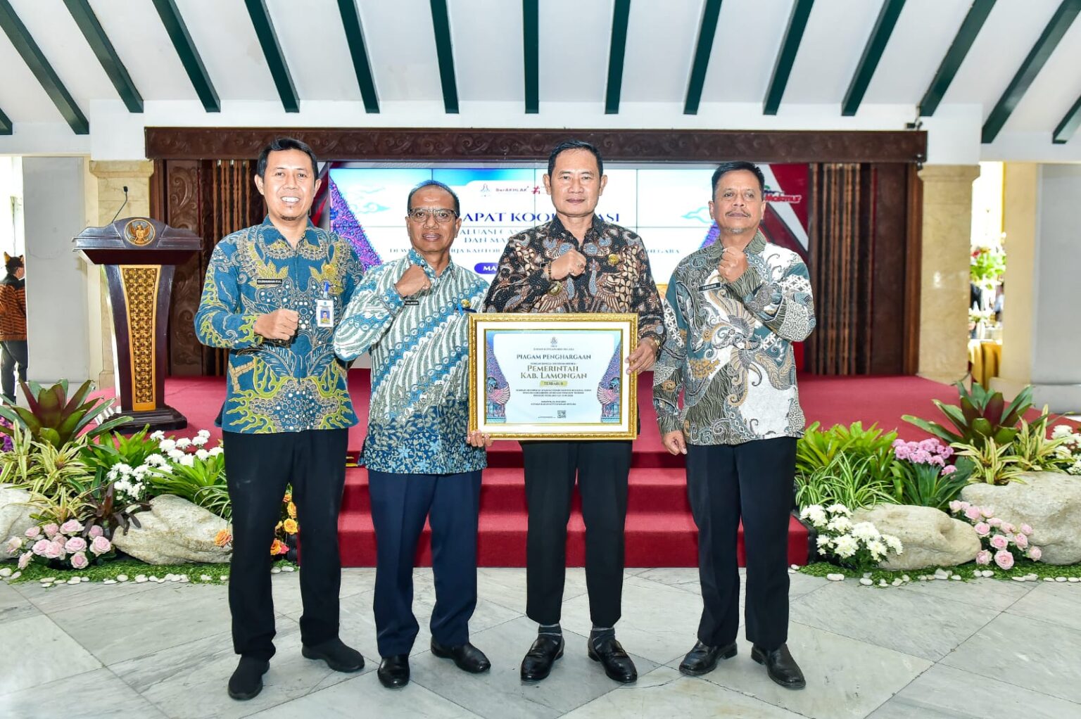 “Hari ini, Pemkab Lamongan menerima penghargaan dari BKN. Penghargaan ini diberikan oleh BKN sebagai bentuk apresiasi atas kinerja pemerintah daerah, dalam mengelola proses kenaikan pangkat pegawai negeri sipil dengan efektif dan efisien,” tutur Pak Yes-sapaan Bupati Lamongan Yuhronur Efendi.