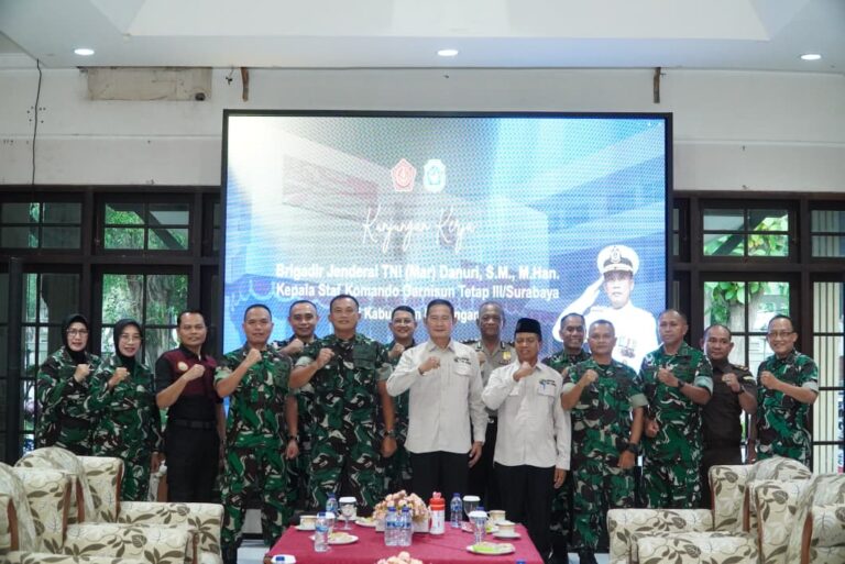 MINATBACA.com – Bupati Lamongan Yuhronur Efendi, menerima kunjungan kerja Kepala Staf Komando Garnisun Tetap (Kaskogartap) III/Surabaya, Brigadir Jenderal TNI (Mar) Danuri.