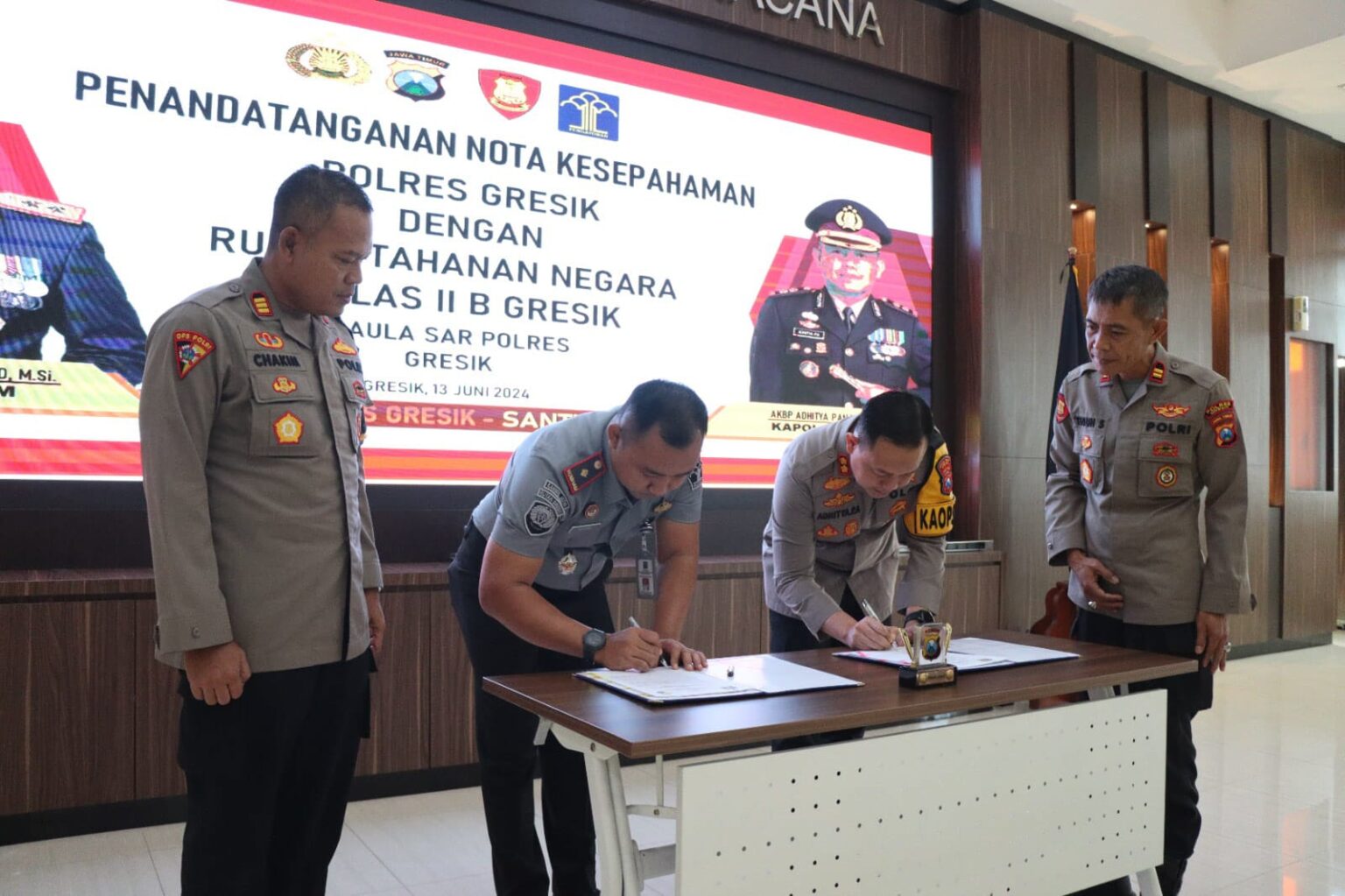 Penandatanganan nota kesepahaman (MoU) dilakukan oleh Kapolres Gresik AKBP Adhitya Panji Anom, bersama dengan Kepala Rutan Kelas IIB Gresik Disri Wulan Agus Tomo. Bertempat di ruang Rupatama Arya Sarja Racana, Kamis (13/6/2024).
