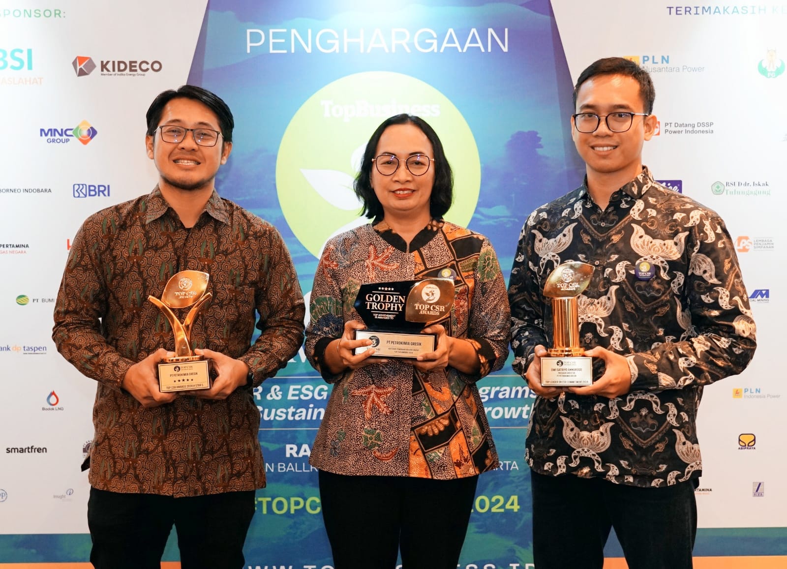 Top Golden Trophy, karena Petrokimia Gresik mampu membawa pulang penghargaan Top CSR 2024 dengan predikat #Stars 5 tiga kali berturut-turut sejak 2022. Termasuk, Direktur Utama Petrokimia Gresik Dwi Satriyo Annurogo yang dinobatkan sebagai Top Leader on CSR Commitment.