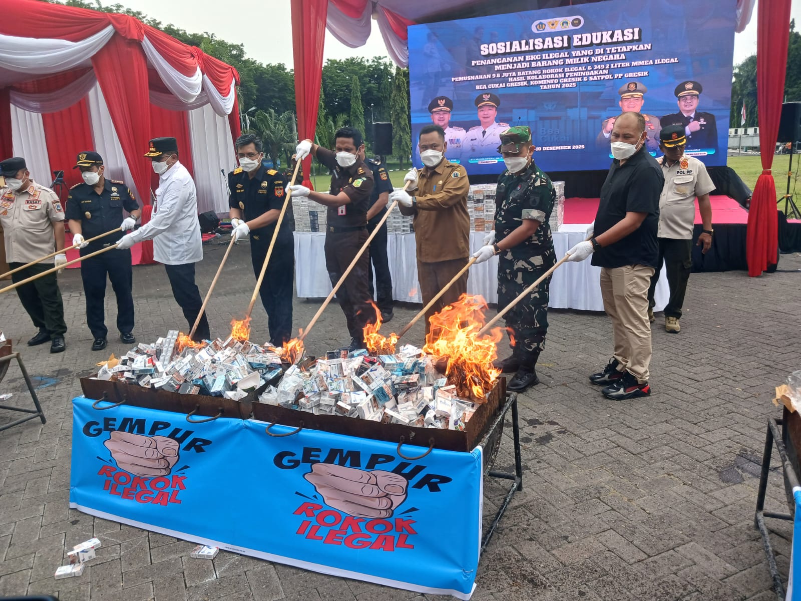 “Ini bisa menjadi pelajaran bagi kita semua, bahwasanya yang kita musnahkan hari ini merugikan kita semua. Maka kami dukung terus penegakan hukum ini, mudah-mudahan Gresik menjadi bebas dari rokok dan minuman beralkohol ilegal,” katanya.